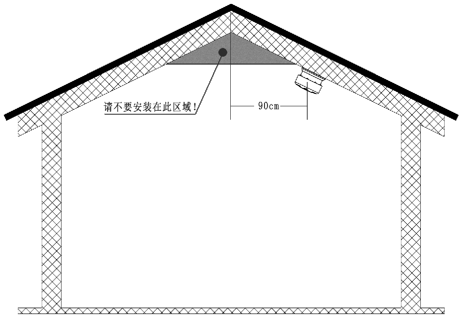 Als u het rookalarm op het hellende of piekplafond installeert, is de installatiepositie ten minste 90 cm van het hoogste punt.
