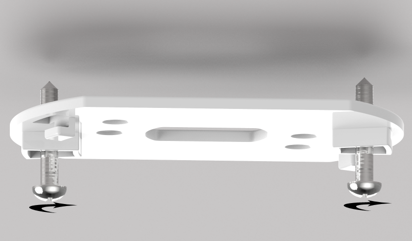 een. Houd de montageplaat tegen de geselecteerde installatiepositie op het plafond en markeer het midden van twee schroefgaten met een potlood. Boor gaten door de potloodmarkeringen en gebruik de bijgevoegde schroeven en ankers om de montageplaat te bevestigen.